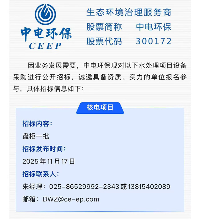 中電環(huán)保股份有限公司是南京市首家環(huán)保上市公司(股票簡(jiǎn)稱(chēng):中電環(huán)保,股票代碼:300172),南京環(huán)保產(chǎn)業(yè)協(xié)會(huì )會(huì )長(cháng)單位,國家級聯(lián)盟理事長(cháng)單位,是生態(tài)環(huán)境治理服務(wù)商,主營(yíng)(3+1):水務(wù)、固危廢、煙氣治理及產(chǎn)業(yè)創(chuàng )新平臺,包括:工業(yè)水處理、污水處理及水環(huán)境綜合治理;固危廢土壤、污泥餐廚垃圾處理;煙氣及VOCS治理;智慧環(huán)保;高端裝備等。